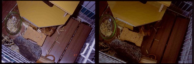 左はフラッシュ使用、右はフラッシュ未使用である。 最近のカメラはよく調光しているなあ。 望遠で寄ってみた。フラッシュ使用。 右が広角側、左が望遠側である。 指が写りこんでいるのはご愛嬌という事で・・・。