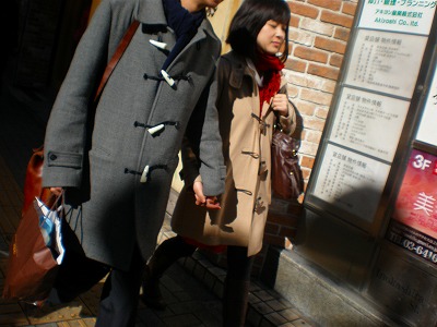 ダッフルコートのカップル。若くなければ着れんワイ。